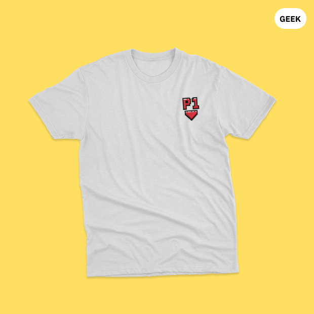 • Design Retrô: A arte em pixel "P1" celebra o espírito dos games clássicos, tornando esta camiseta um item essencial para qualquer gamer.